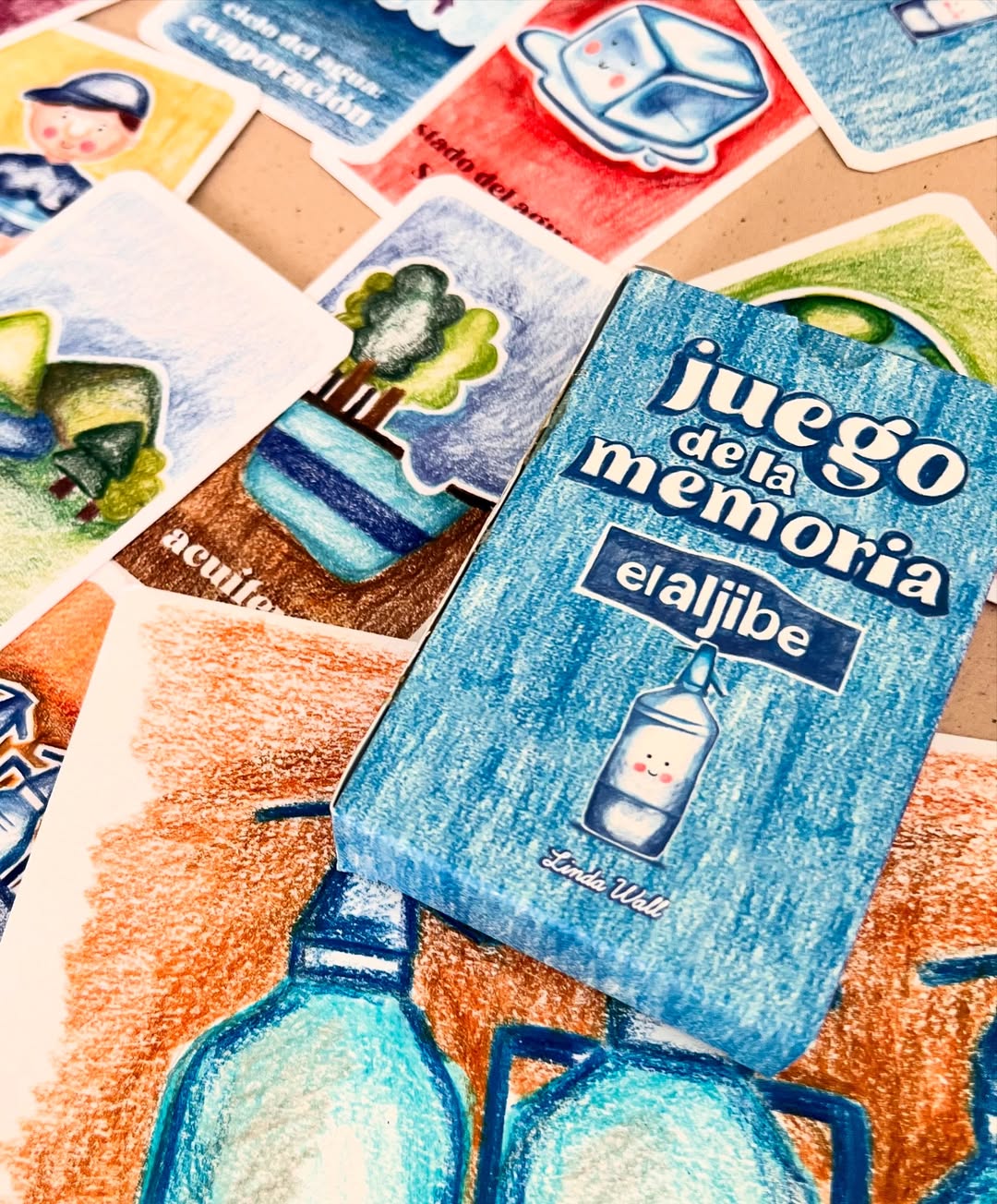 El Aljibe Juego de memoria con 42 cartas ilustradas por Linda Wall, inspirado en los productos oficiales de El Aljibe. Lúdico, educativo y coleccionable.
